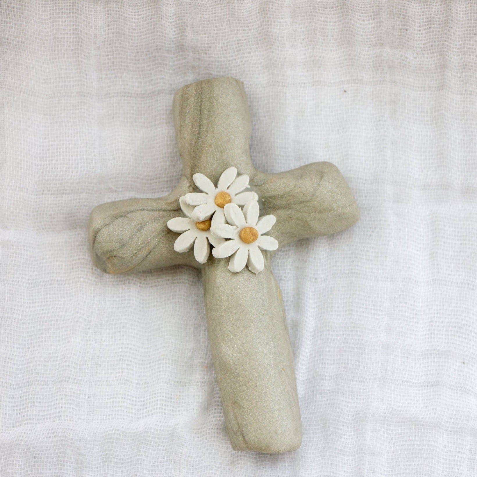 Handmade by survivor-artisans, the Bloom prayer cross is made with marbled clay and features daisy flowers in the center. While the clay is still soft, the artisan holds the prayer cross and prays for the person who will own it. This blesses the prayer cross and makes it perfectly comfortable for any hand to hold.
