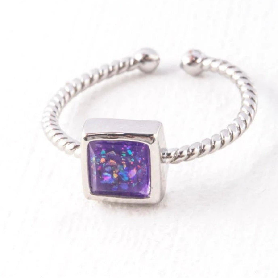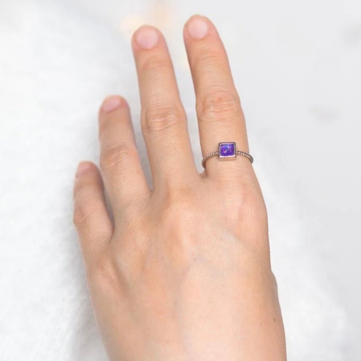 This beautiful and dainty ring in white gold showcases a beautiful synthetic opal.