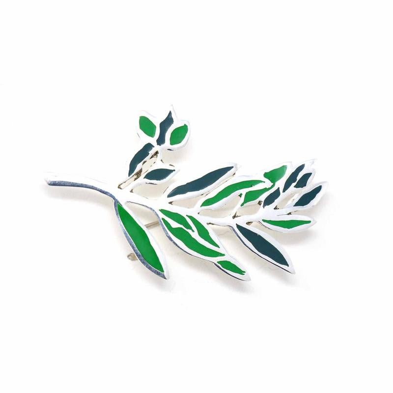 Introducing the Green Branch brooch! This stylish accessory is handcrafted with silver-plated metal and features a tree branch design with inlaid green leaves. Measuring approximately 2.25" in length, this brooch is perfect for adding a touch of nature-inspired flair to your look.