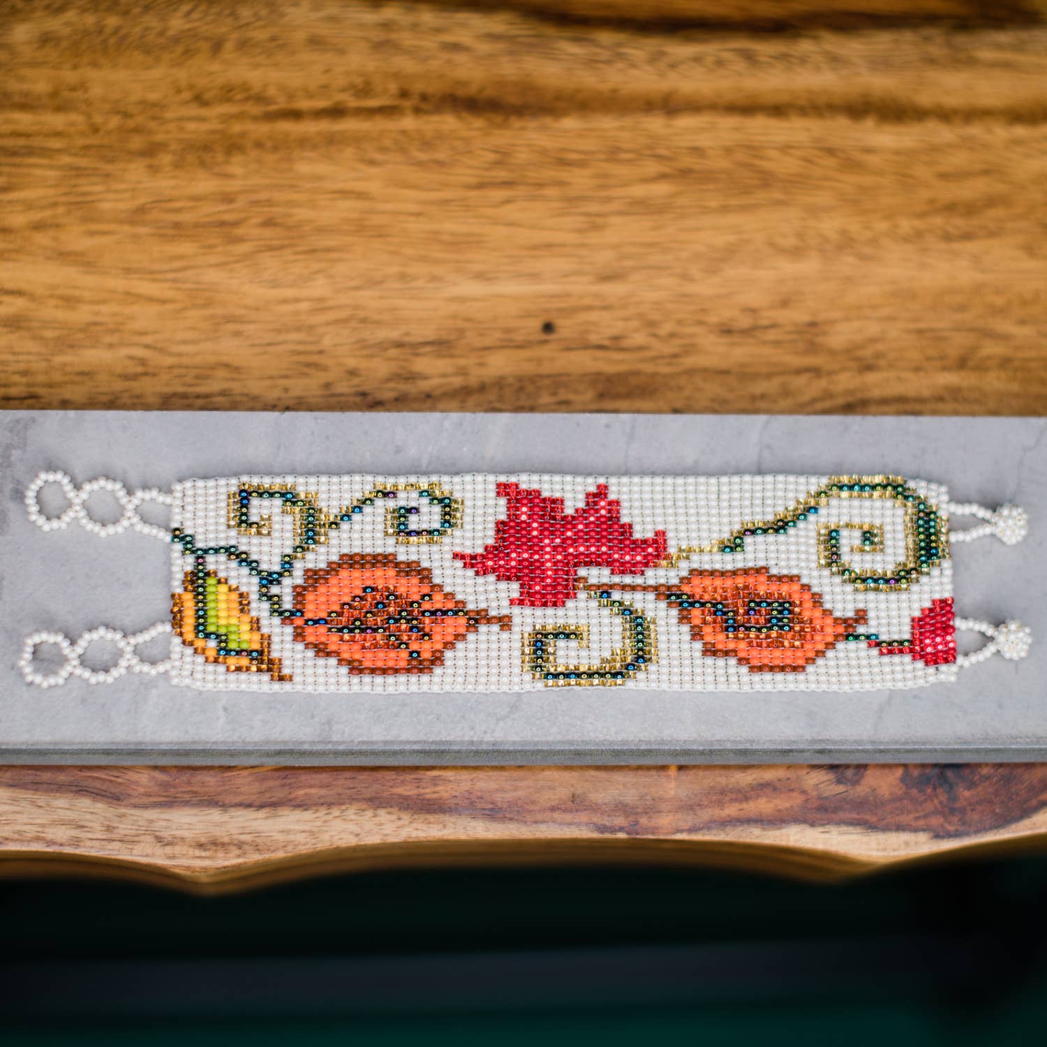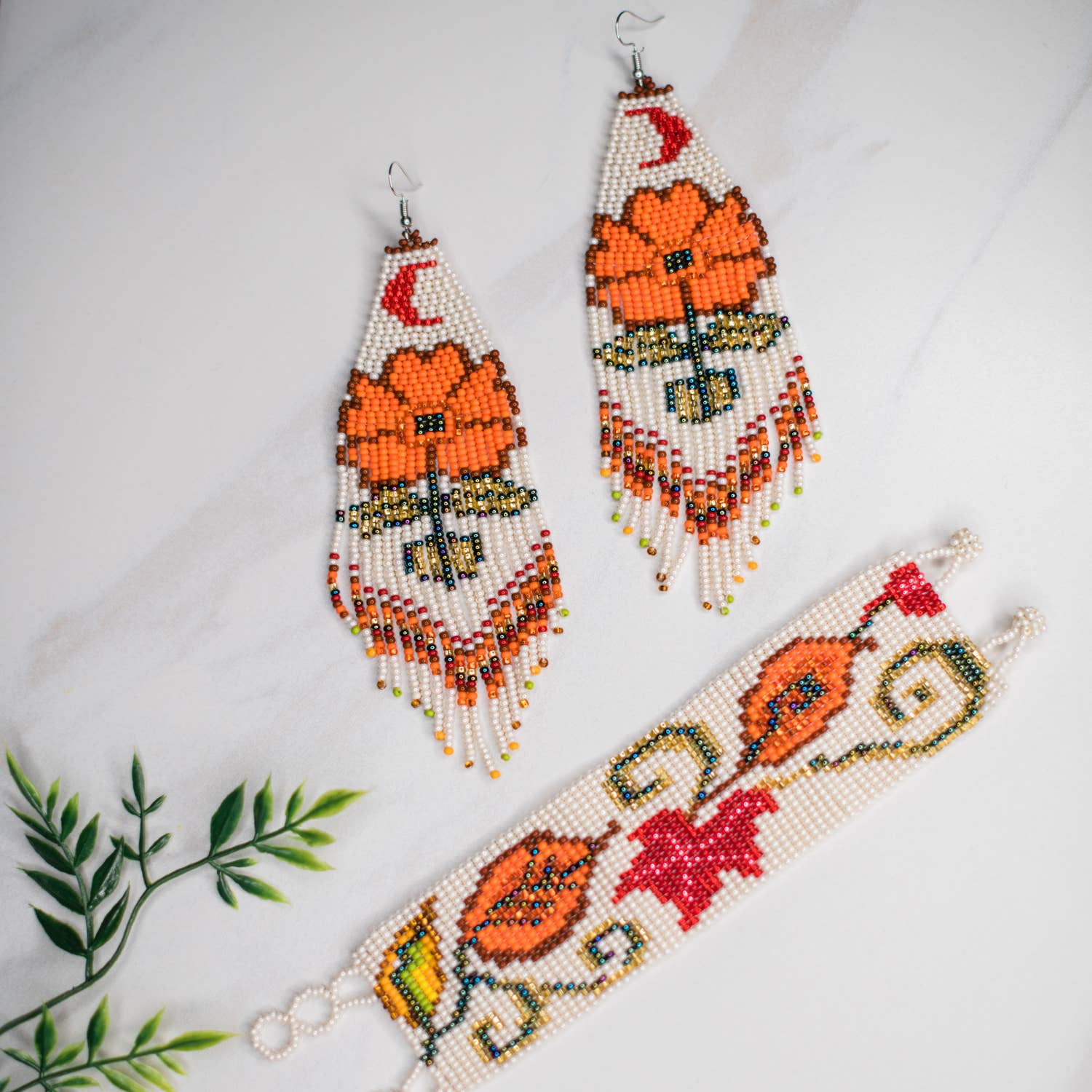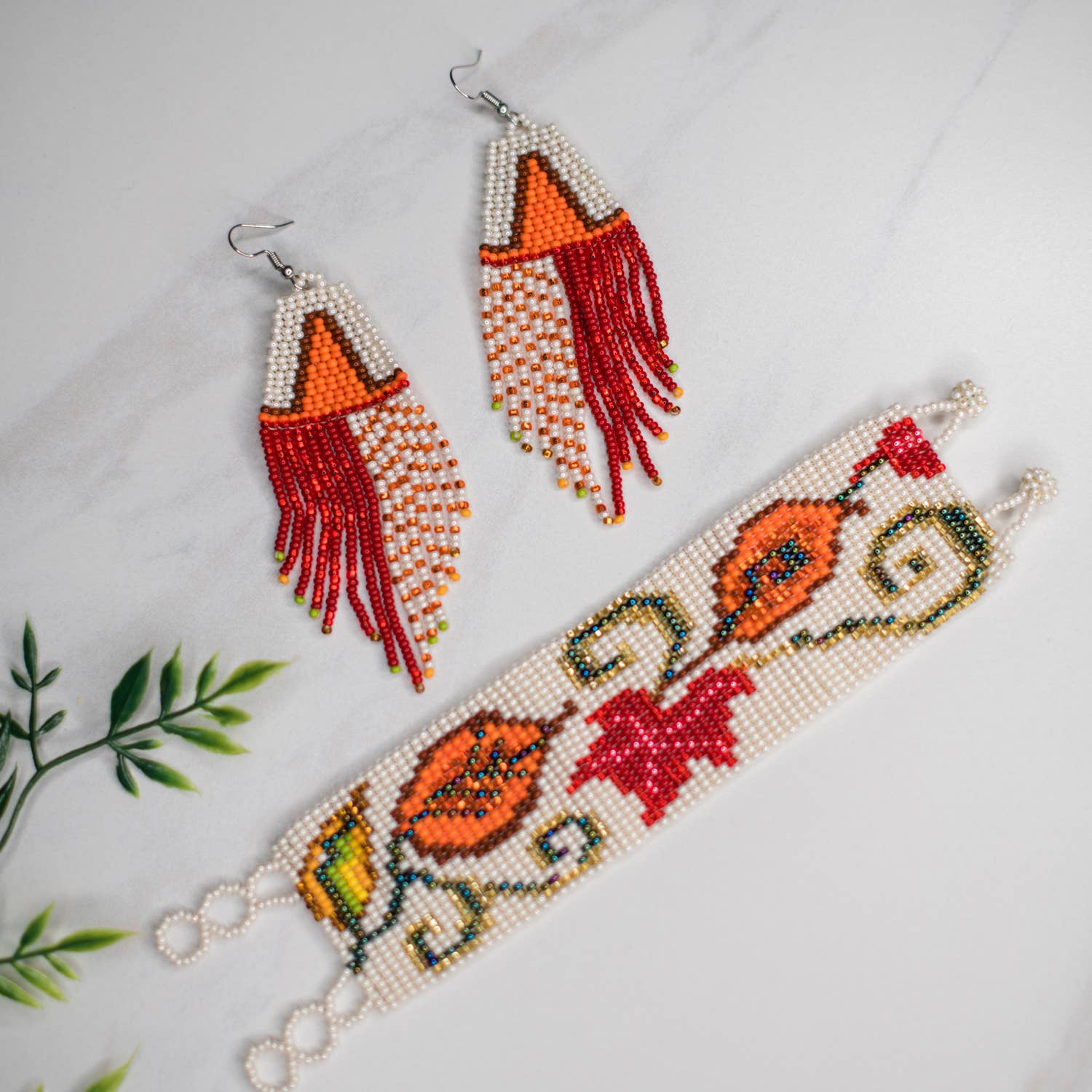 The Cala Lily Bracelet is a stunning cuff handbeaded in an elegant cream with vibrant earth tone oranges and reds.