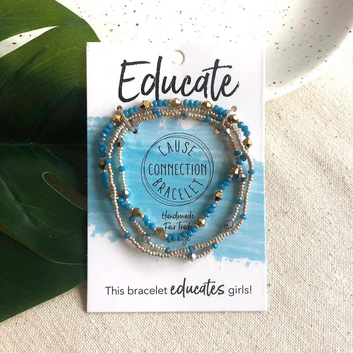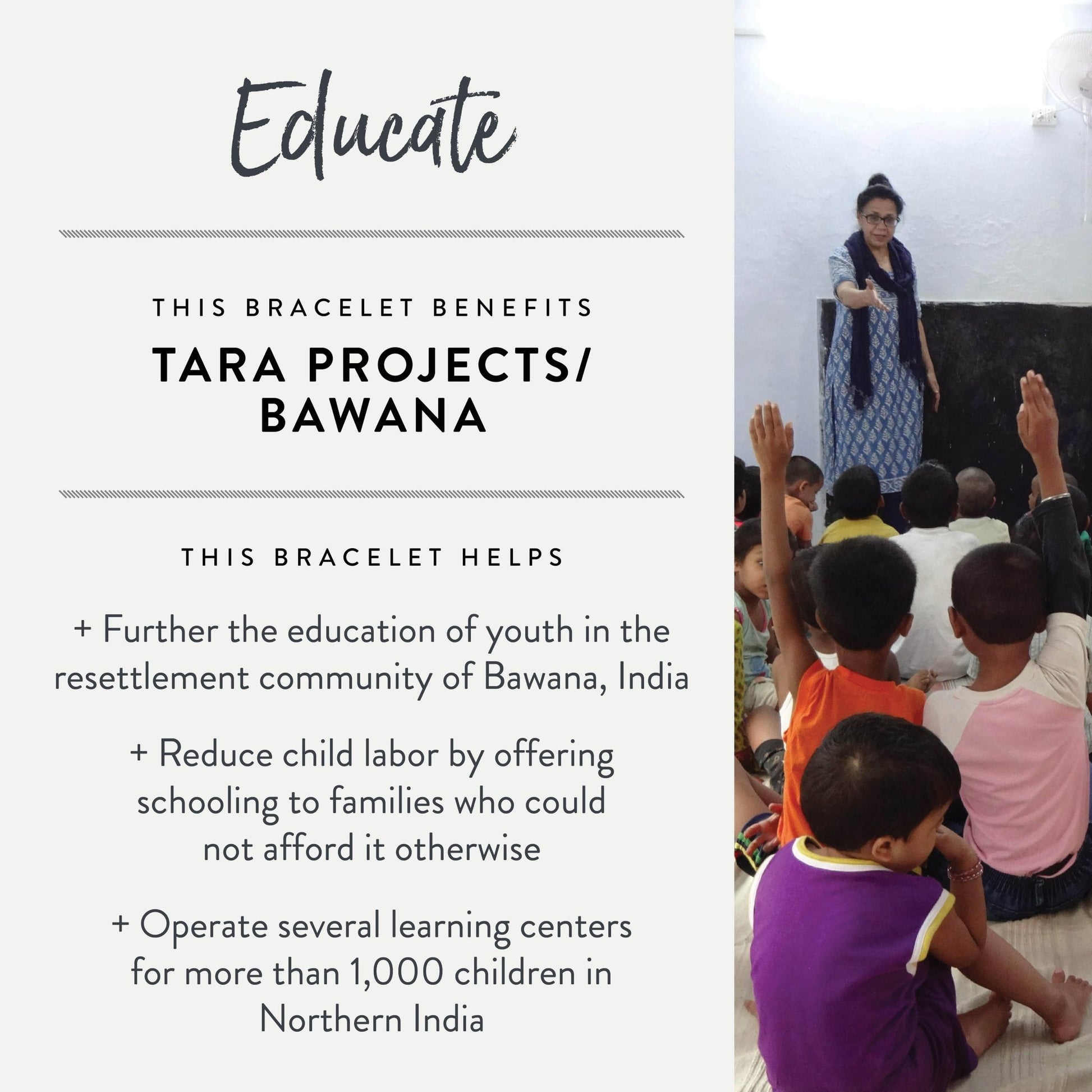 The Educate bracelet creates goodness on so many levels! Each three-stranded bracelet is not only handmade by women artisans in India, but it also provides funds to help educate children in India's Bawana community. This carded design makes a great gift item. WorldFinds donate 15% of the wholesale price of these bracelets directly to the Bawana community through their artisan partners Tara Projects.
