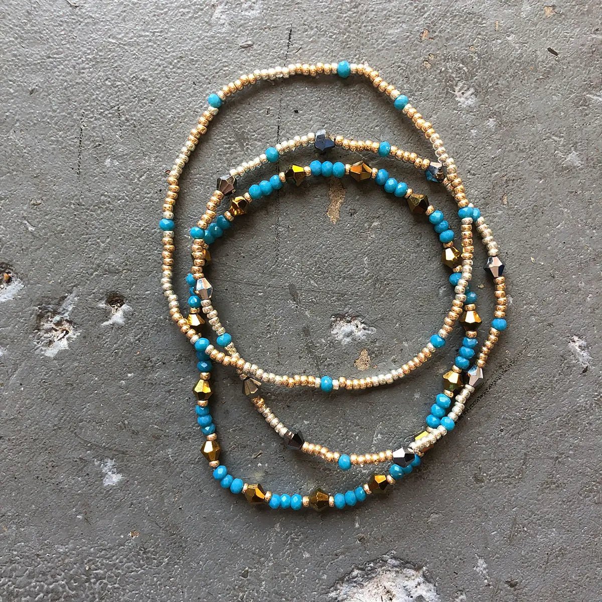 Beads measure .125" wide and are made of glass and a brass/metal mix. Bracelet stretches to fit most wrists. Sustainably handmade by women artisans in India.