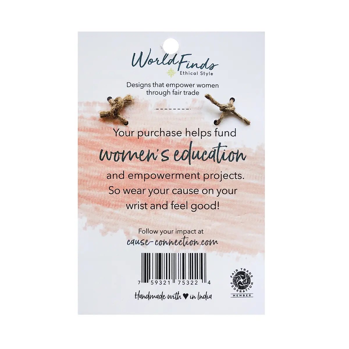 The Empower bracelet creates goodness on so many levels! Each three-stranded bracelet is not only handmade by women artisans in India, but it also provides funds for women's education and empowerment projects. This carded design makes a great gift item. WorldFinds donates 15% of the wholesale price to the In Her Shoes Foundation, which helps women empower women.