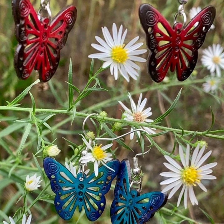 Dangle & Drop Butterfly gourd earrings. Each pair of earrings is laser etched from dried/baked gourds and then hand-painted. Each earring is mounted with a stainless steel shepherd's earring hook and is extremely lightweight. These unique earrings would make a beautiful and unique gift for any occasion!